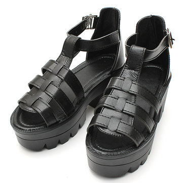 Les femmes d'été en cuir de plage en plein air vintage rétro peep toe boucle chunky sandales à talons