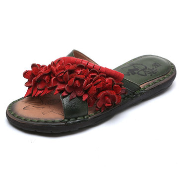 Sandales& décontractées& pour& femmes& à& fleurs plates Sandales décontractées en cuir véritable