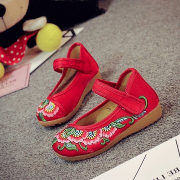 Filles, vieux, peking, style, fleur, broderie, mary, jane, chaussures, enfants, toile, appartements