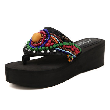 Les femmes perles d'été coloré pince orteil vent nationale plage cru plateforme tongs pantoufle